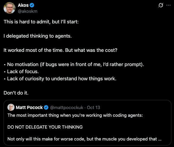 If we keep delegating to AI everything that turned us into good professionals, coding agents don’t have to outsmart us; we simply need to fall to their level.